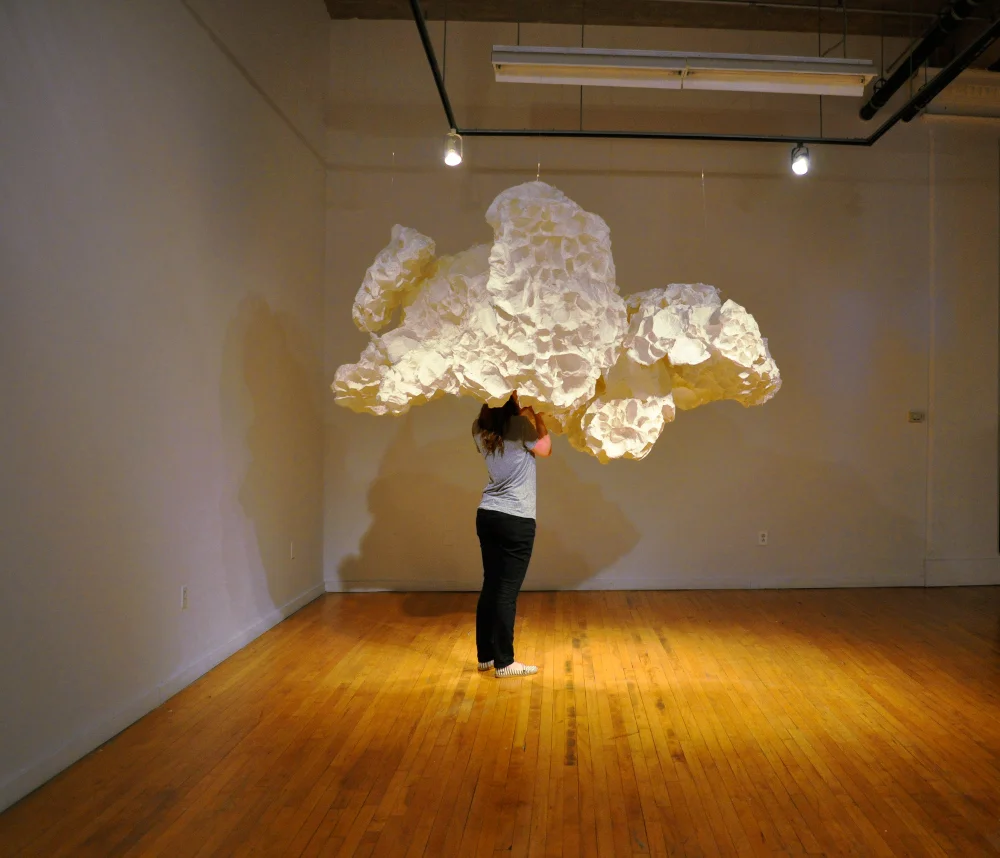 Breath (Installation View), Paper, glue, and recorded sounds of meditative breathing, Approx. 60” x 96” x 48”, 2014